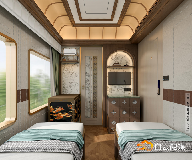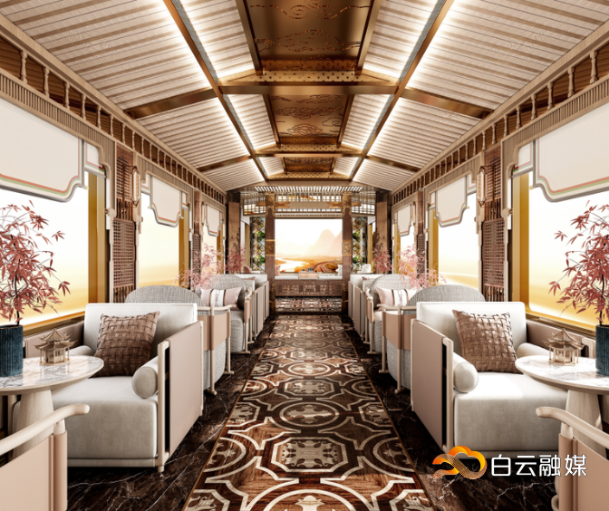 2026年,白云号以“中国文化探索”为核心,斥资数千万元打造集栖居、美食、休闲、观景于一体的移动中式美学空间。全列18节车厢仅定员96人,低密度布局拉满私享感,一车厢一主题、一空间一意境,将传统建筑的东方意境与现代旅居的舒适需求深度融合,为旅客带来沉浸式文化旅行体验。